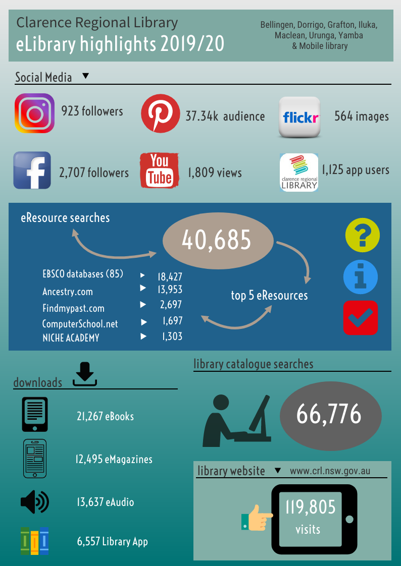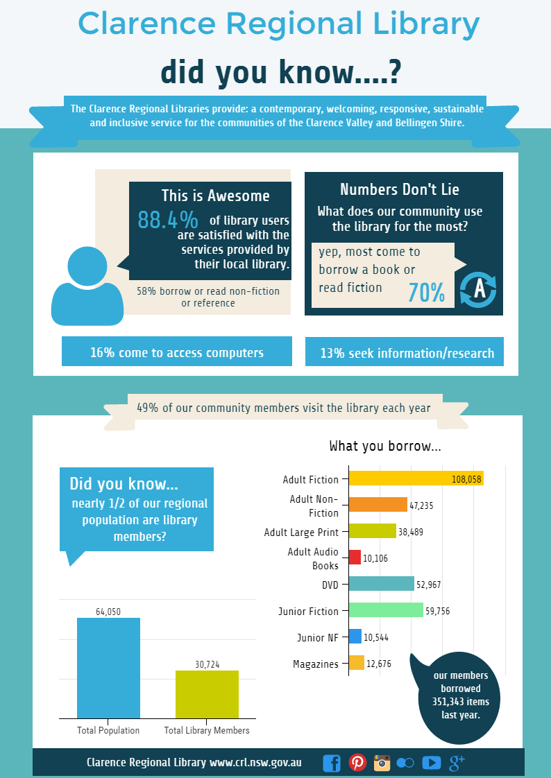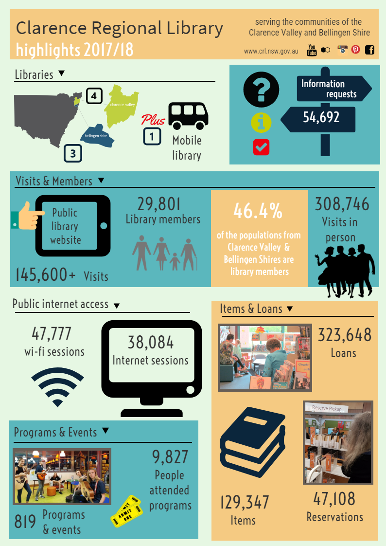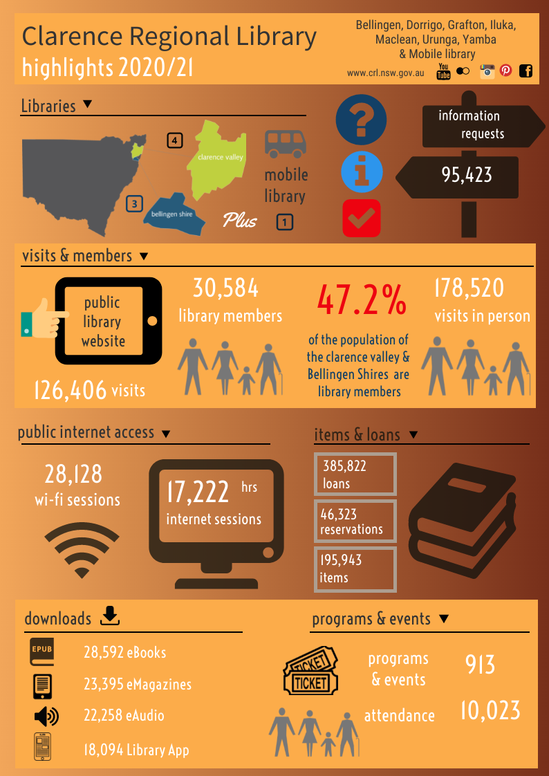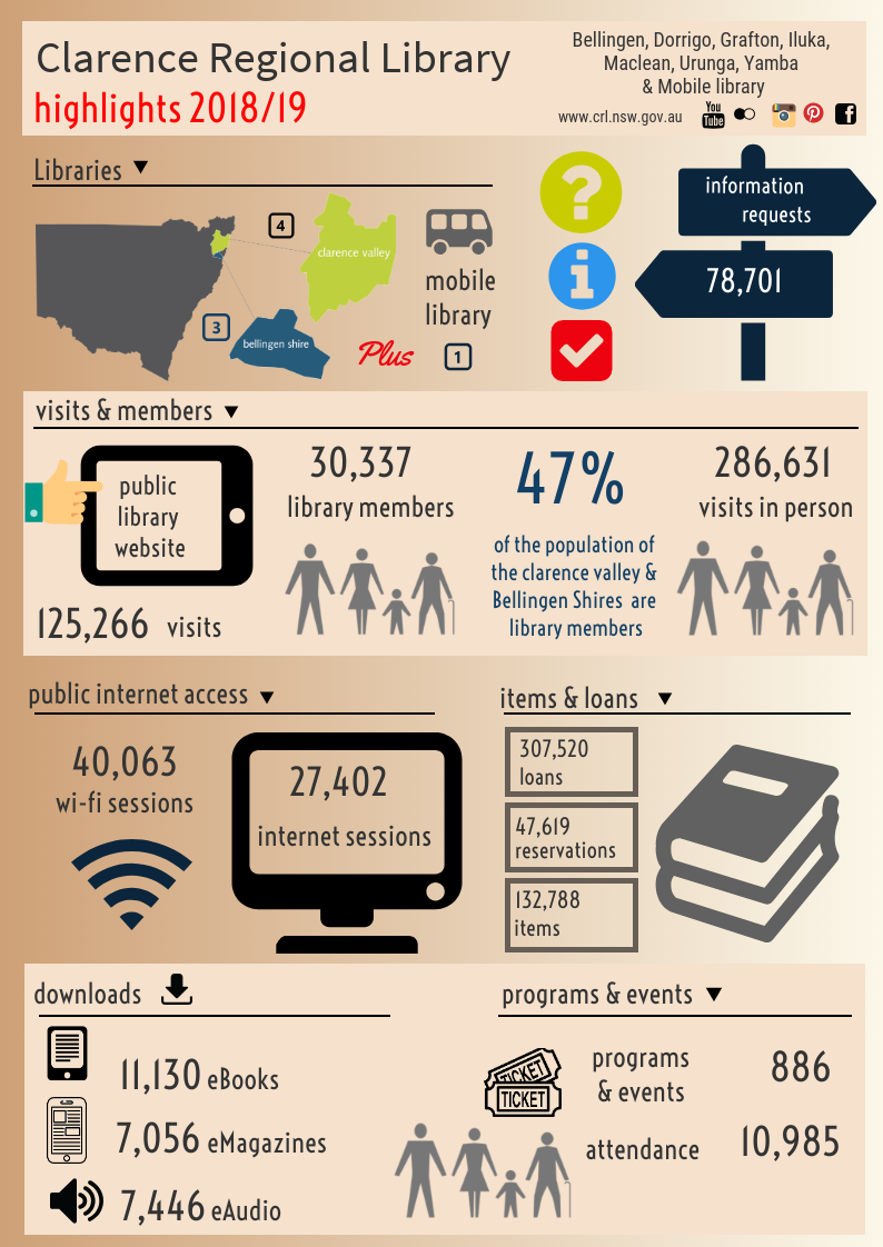 Clarence Regional Library has libraries in Bellingen, Dorrigo, Grafton, Iluka, Maclean, Urunga, and Yamba plus a Mobile Library operating out of Grafton Library.